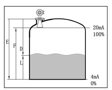通過(guò)輸入空罐高度E(=零點(diǎn)),滿罐高度F(=滿量程)及一些應(yīng)用參數(shù)來(lái)設(shè)定,應(yīng)用參數(shù)將自動(dòng)使儀表適應(yīng)測(cè)量環(huán)境。對(duì)應(yīng)于4-20mA輸出。