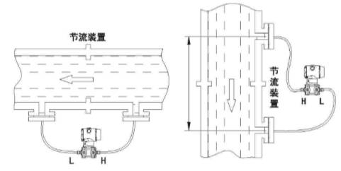 對不能用導壓管引出的介質,可用雙法蘭差壓變送器進行流量測量,其裝置見下圖,測量水平管道時,兩法蘭同在一水平面上,不存在液位差,不考慮遷移,測量垂直管道是,始終承受(r-r0)H的液位壓差故儀表應有(r-r0)H正遷移量。
