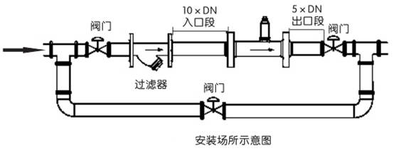 渦輪流量計(jì)對(duì)管道內(nèi)流速分布畸變及旋轉(zhuǎn)流是敏感的,進(jìn)入傳感器應(yīng)為充分發(fā)展湍流,因此要根據(jù)傳感器上游側(cè)阻流件類(lèi)型配備必要的直管段或整流器,要求入口段和出口段直管段長(zhǎng)度。