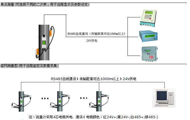 一次表與二次表(或計算機)之間采用RS-485總線通訊,采用普通電纜即可,傳輸距離可達1000米以上,組網(wǎng)十分方便、快捷。這種傳輸方式抗干擾能力好,解決了分體式超聲波流量計專用電纜成本高、抗干擾能力差、傳輸距離短等問題。