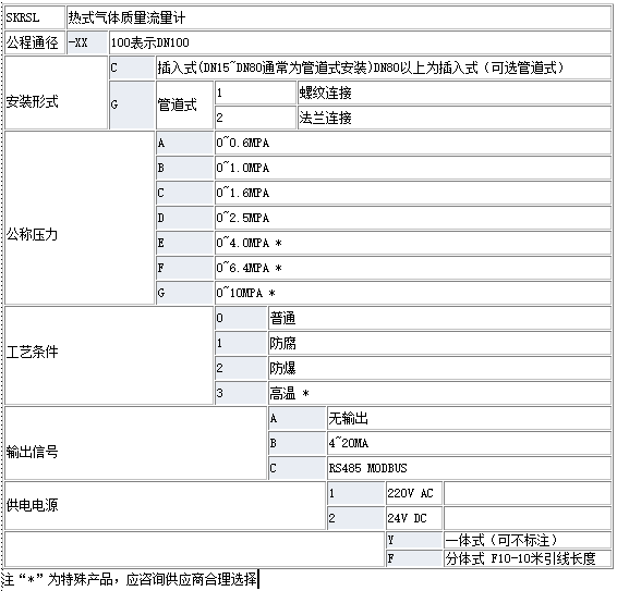 SKRSL系列熱式氣體質(zhì)量流量計 熱式氣體質(zhì)量流量計是利用熱傳導(dǎo)原理測量流體流量的儀表,該儀表采用恒溫差法對氣體質(zhì)量流量進(jìn)行準(zhǔn)確測量。熱式氣體質(zhì)量流量計具有體積小,數(shù)字化程度高,安裝方便,測量準(zhǔn)確等優(yōu)點。 一、SKRSL系列熱式氣體質(zhì)量流量計產(chǎn)品優(yōu)勢: 1、特有流量數(shù)據(jù)模型算法;模糊理論控制溫度、濕度算法; 2、智能微處理器及模數(shù)、數(shù)模轉(zhuǎn)換芯片; 3、寬量程比1000:1;大口徑,低流速,壓損可忽略; 4、直接測量質(zhì)量流量,無須溫壓補償; 5、低流速測量非常靈敏; 6、設(shè)計、選型方便,安裝、使用簡便; 7、適合各類單一或混合氣體流量測量。 二、SKRSL系列熱式氣體質(zhì)量流量計產(chǎn)品特點: 1、采用鉑RTD傳感器技術(shù) 2、采用享有“平衡結(jié)構(gòu)封裝”技術(shù),介質(zhì)溫度自補償 3、特有算法,可實現(xiàn)線性、重復(fù)性、精度好 4、量程比寬1000:1,可據(jù)用戶要求可拓展 5、可實現(xiàn)大管徑小流量測量,最小流量可測低至零,分辨率0.001m/s 6、無可動部件、振動影響可忽略 7、直管段要求不高1-2D 8、與介質(zhì)的溫度、壓力無關(guān) 9、特有高溫算法,介質(zhì)溫度可達(dá)+400℃, 10、采用高濕算法,實現(xiàn)精度準(zhǔn)確測量 11、對流量信號鍵入12點動態(tài)修正,內(nèi)置10點修正 12、在線動態(tài)校正電流/電壓輸出 13、對粉塵等小顆粒不敏感 14、在線不斷流裝卸,維護(hù)方便 三、熱式氣體質(zhì)量流量計應(yīng)用場合: 1、公用工程---電﹑氣﹑ 水處理的監(jiān)控 管道的氣體;通用系統(tǒng);沼氣;煤氣;天然氣;液化氣;鍋爐預(yù)熱空氣 2、石油與天然氣工業(yè) 能量交換;填井氣回收;燃?xì)庥嬃浚粴怏w質(zhì)量分析;泄漏氣測試;天然氣測量;火炬氣的監(jiān)控 3、電力行業(yè) 燃料系統(tǒng)中氣體分配過程中的氣體測量;鍋爐及輔助系統(tǒng)中各種氣體的測量;燃?xì)鉅t中氣體測量;氫氣測量;電廠高爐的一次風(fēng)、二次風(fēng)的測量 4、化學(xué)行業(yè) 煙氣循環(huán)監(jiān)測;采樣系統(tǒng)中氣體流量計量;引風(fēng)機的氣體流量計量;化肥廠氨氣測量 ;電池工廠各種氣體流量測量 5、冶金行業(yè) 鋼鐵廠加氣測量;煉鐵廠高爐煤氣的測量;焦化廠焦?fàn)t煤氣的測量;軋鋼廠加熱爐燃?xì)猓ǜ郀t煤氣、焦化煤氣、天然氣等)的測量控制;熱處理淬火爐等的氫、氧、氮等氣體的控制 6、紙漿與造紙行業(yè) 廢水處理系統(tǒng)中氣體的測量;煙道流量監(jiān)控;鍋爐回收二次/三次空氣;鍋爐的燃?xì)夂涂諝馑惋L(fēng)測量 7、食品及醫(yī)藥行業(yè) 加工操作中新鮮空氣的加入;啤酒廠中的二氧化碳處理;瓶子消毒器中的熱空氣的流量;熱氧化過程中氣體流量測量;通風(fēng)系統(tǒng);鍋爐進(jìn)氣﹑廢氣﹑過程控制 8、環(huán)保 沼氣利用過程中的氣體測量;氯氣處理過程中氯氣氣體測量;污水處理過程中曝氣池的氣體測量;煙筒煙道排氣監(jiān)測SO2和NOX的排量 9、其他行業(yè) 工廠壓縮空氣測量;煤粉燃燒過程粉/氣配比控制燃料;水泥工業(yè)豎式磨粉機排放熱氣流量控制 四、熱式氣體質(zhì)量流量計性能指標(biāo): 1、測量范圍:0.5—100Nm/s (20℃,101.33KPa) 2、精度: ±1.5%的讀數(shù) ±1.5%滿量程 3、量程比:通常100:1(取決于標(biāo)定流量的范圍) 4、管徑范圍:DN20~5000mm 5、應(yīng)用范圍:適合各類單一或混合氣體。含塵、含沙、含濕氣、各種腐蝕性氣體。(乙炔氣體除外) 6、環(huán)境溫度范圍: -40℃~+85℃(無顯示); -30℃~+70℃(有顯示); 濕度小于90%RH 7、介質(zhì)溫度范圍: -40℃~+100℃;-40℃~+200℃; 8、傳感器直徑:ф3、ф2.5 9、插入式傳感器探桿直徑:ф19(標(biāo)準(zhǔn))、ф16、ф12 10、傳感器材質(zhì):316不銹鋼、哈氏合金、鈦 11、探桿材質(zhì)(保護(hù)套):316不銹鋼(標(biāo)準(zhǔn))、哈氏合金 12、雙向測量介質(zhì)流量 13、模擬量輸出:流量:4-20mADC,溫度:4-20mADC,最大負(fù)載:1000Ω 14、累積脈沖量輸出 15、鍵入12段非線性修正,內(nèi)置10段非線性修正 16、通訊:串口輸出RS232/RS485 17、供電電源:24VDC/600mA;220VAC/2W;110VAC/3W 18、報警:1-2路繼電器輸出、5A/220V、5A/30VDC、鍵入設(shè)定 19、大屏幕LCD顯示:七位瞬時流量,八位累積流量 20、過程壓力:1.6Mpa(最大20MPa) 21、安裝工藝形式:插入式(卡套、卡套+球閥、法蘭連接)適用于DN80以上的管道安裝,管道式(法蘭、螺紋連接)適用于DN15以上的管道安裝。 22、防爆等級:本安型(iaⅡCT5)、隔爆型(ExdⅡCT4) 23、防護(hù)等級:IP65 五、傳感器參數(shù): 管段傳感器數(shù)據(jù)表 (螺紋連接) ![]() 注:DN<20mm時,傳感器尺寸請咨詢我公司 管段傳感器尺寸表(法蘭連接) ![]() 六、口徑與流量對應(yīng)表 ![]() 七、產(chǎn)品選型: