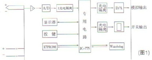 智能流量積算儀是由測量回路、數(shù)字面板表、調(diào)節(jié)器和電源四個(gè)部分組成。穩(wěn)壓電源將220V供電轉(zhuǎn)換成穩(wěn)定的直流電壓作為其它部分電源。測量回路將流量變送器送來的信號(電壓、電流等)經(jīng)過處理后,變?yōu)殡妷盒盘枴T撔盘柦?jīng)過A/D轉(zhuǎn)換后輸送到JC-775專用中央處理器進(jìn)行處理后,不僅要送到數(shù)字面板表,而且也要送到調(diào)節(jié)器,與設(shè)定值比較后按調(diào)節(jié)規(guī)律輸出控制或報(bào)警信號。工作原理框(圖1)