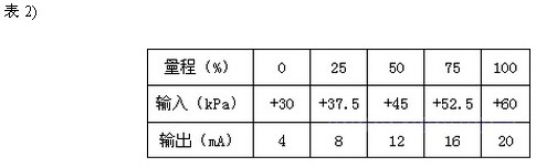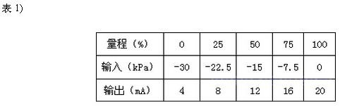 調(diào)校時(shí),正壓室接輸入信號(hào),負(fù)壓室通大氣。假設(shè)儀表量程仍為30kPa,遷移量ρgh=30kPa。 輸入與輸出的關(guān)系見(jiàn)表2)。