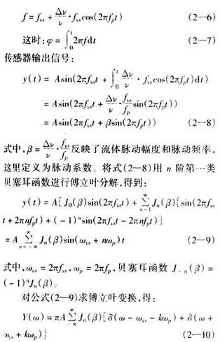 1 引 言 在過程控制和流體計量中,渦街流量計應用相當廣泛。渦街流量計本質(zhì)上是一種流體振動型流量計,因此易受測量現(xiàn)場的機械振動和不穩(wěn)定流場等噪聲的干擾,測量精度往往得不到保證。如何從含有噪聲的信號中提取流量信息,是流量測量一直沒能很好解決的難題,F(xiàn)場的噪聲各種各樣,其中,脈動流是一種對測量精度影響較大的噪聲干擾。 筆者根據(jù)國外研究成果,從理論上分析了脈動流干擾下渦街傳感器的輸出信號,采用貝塞耳函數(shù)分解出渦街流量信號頻率和脈動干擾頻率,分析流體脈動對渦街流量計測量的影響;說明了在脈動流干擾下出現(xiàn)的鎖定現(xiàn)象;提出了提高流量計測量精度的方法。 2脈動流對測量的影響 2.1渦街流量計測量原理 渦街流量計是基于“卡門渦街”原理的流體振動型流量計,壓電傳感器表體內(nèi)有一個漩渦發(fā)生體,當流體流過漩渦發(fā)生體時,在其后部兩側交替產(chǎn)生兩列漩渦,一側漩渦分離的頻率與流體的流速成正比。 其中,f為漩渦分離頻率(Hz);ν為管道內(nèi)流體的平均流速(m/s);St為斯特羅哈常數(shù);d為漩渦發(fā)生體迎流面寬度(m);D為管道內(nèi)徑(m)。 漩渦的分離頻率在一定雷諾數(shù)范圍內(nèi)與通過管道的流體流量成線性關系: 因而,通過測量漩渦分離頻率,就可知道流體的流速,測出通過管道的流體的流量。 2.2脈動流條件下渦街流量計測量結果 在流體穩(wěn)定流動條件下,壓電傳感器輸出的電壓信號為正弦波。正弦波的頻率與流體的流速成正比,幅度與流體的密度和速度的平方成正比。 流體穩(wěn)定流動狀態(tài)下,管道內(nèi)流體流動平均速度為ν。在脈動流作用下,管道內(nèi)流體的流速疊加了隨時間周期變化的脈動分量[1]: 式中,Δν為流體脈動時偏離穩(wěn)態(tài)流速的最大幅度,fp為脈動頻率。 因為漩渦分離頻率與管道內(nèi)流體流動速度成正比,所以脈動流條件下的漩渦分離的瞬時頻率為: 流體脈動條件下,渦街流量計輸出信號疊加了調(diào)頻噪聲。從公式(2—10)可以看出,輸出信號的頻譜包含以渦街信號主頻率fνs為中心的較寬的頻帶,fνs左右兩則對稱分布了無窮多邊頻分量,邊頻分量和主頻分量之間的間隔恰為脈動頻率的整數(shù)倍,它們的幅度大小由對應的各階貝塞耳函數(shù)所決定。 脈動系數(shù)β也是一個重要的參數(shù),它的大小變化對輸出信號的頻譜結構有著重要的作用。由貝塞耳函數(shù)曲線(如圖2—1所示)可知,當β≤1時,只有J0(β)和J1(β)有比較大的數(shù)值,而J2(β),J3(β)等均可以忽略,因此,輸出信號的頻譜實際上只有ωνs和wνs±nwp組成。當β>1時,隨著β的增大,邊頻分量數(shù)目增多。