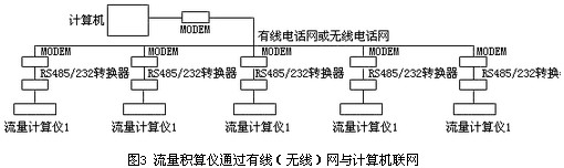 另一種是遠距離的網(wǎng)絡(luò)通訊,如熱力公司向市內(nèi)的多個用熱企業(yè)供熱,可以通過有線電話或無線電話,將流量儀表與計算機構(gòu)成網(wǎng)絡(luò)。如圖3所示。