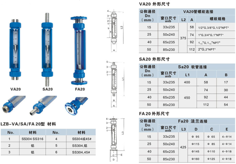 LZB-VA/SA/FA20玻璃轉(zhuǎn)子流量計與同類產(chǎn)品比較具有測量精度高,互換性好,連接方式多等優(yōu)點?商峁┖撩讟顺;百分標尺;流量標尺和可拆卸的外標度尺,方便不同用戶使用,連接方式有LZB-VA2O管螺紋連接,LZB-SA20軟管連接,LZB-FA20法蘭連接(活套法蘭結(jié)構(gòu))。